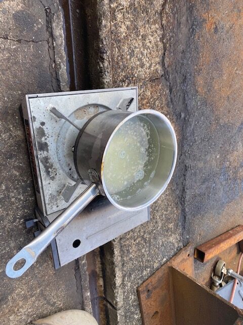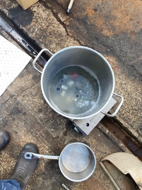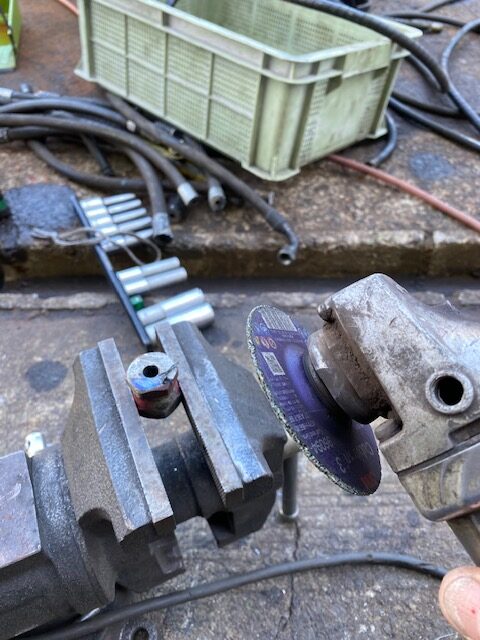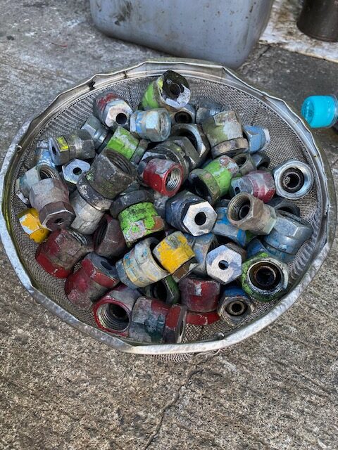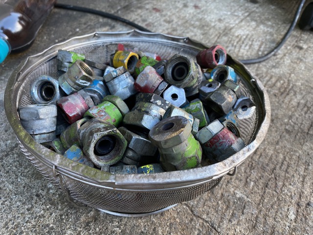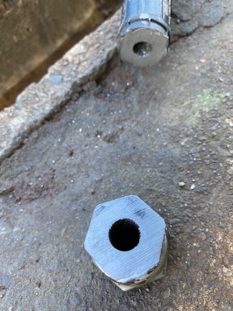 前回の作製時は、洗いもそこそこ適当なまま溶接しちゃったら、ネジ内部の加締め部に屑と油が焼き付いて実際プラグとして使用するときに、締め加減がガジリッぽくなってしまったので、今回はきっちり切断面の処理とペンキ剥がし、洗浄工程を徹底してから溶接することにします。いくら廃材でも横着すると、せっかくの手間が無駄になっちゃうから、下処理は徹底することにします。プラグも新品は4分以上にもなると結構な価格しますし、数が必要なので、どうせ廃材から作製するにせよ、丁寧に作製するようにします。