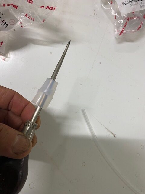いろんなスタイルあると思いますが、ガイドラインに従ってステンレス保護管つけてテフロンチューブ(PTFEチューブ)で採取してます。