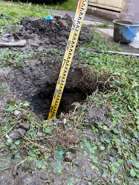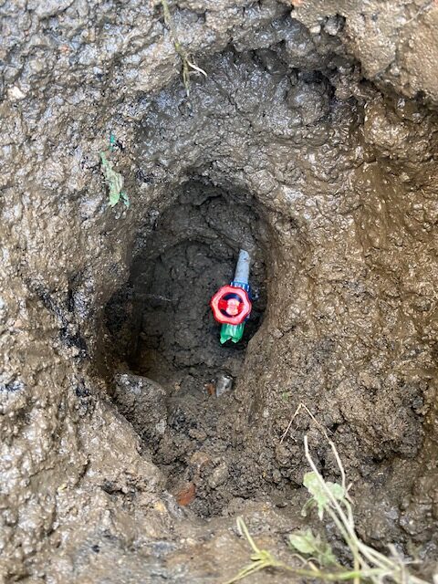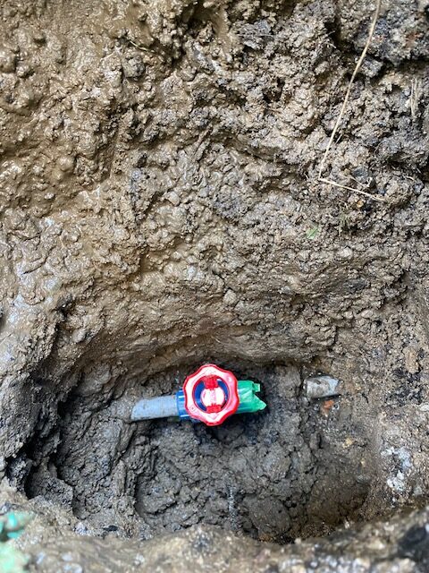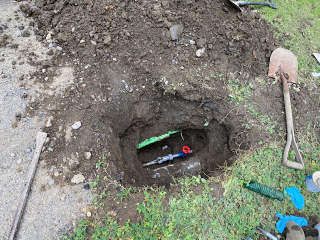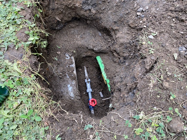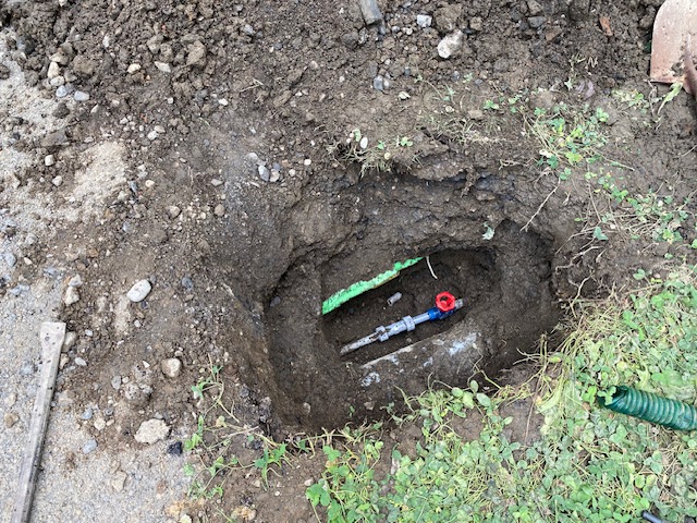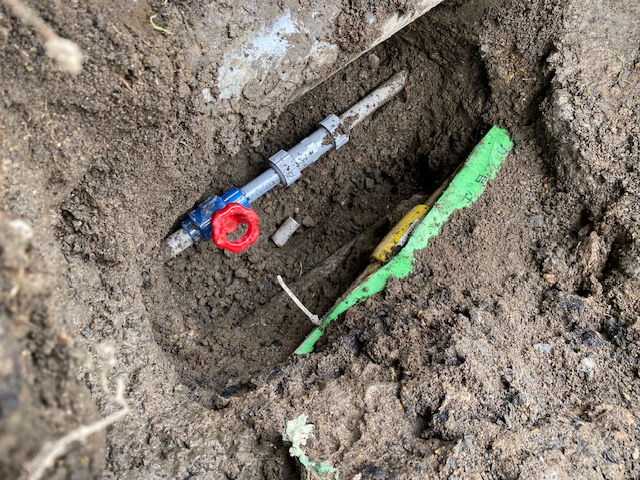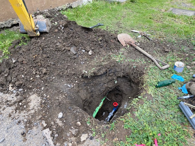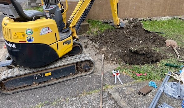 さて、大事にならない規模のトラブルでしたので、いつも可能な限り自社で対応します。やはり一人では何も出来ないもので、色々力を借りるのが、いつもの仲間。何とか止水栓を見つけて当日中に下準備までは自分でこなして、翌日ユンボーを運び入れて、2人で復帰。