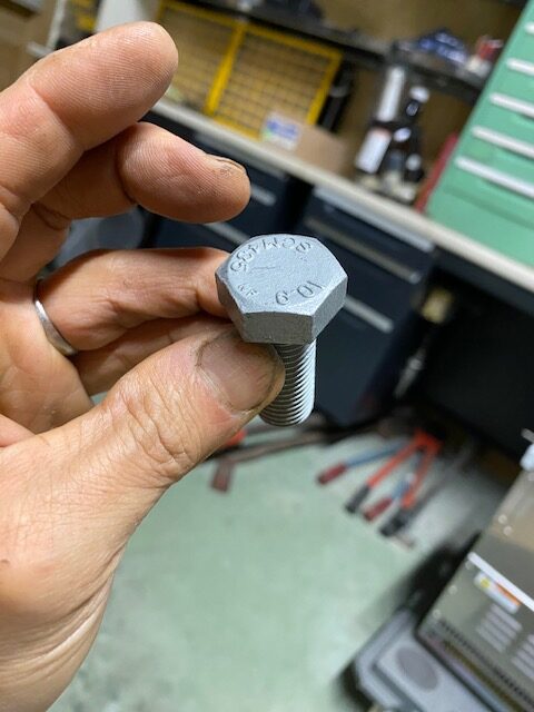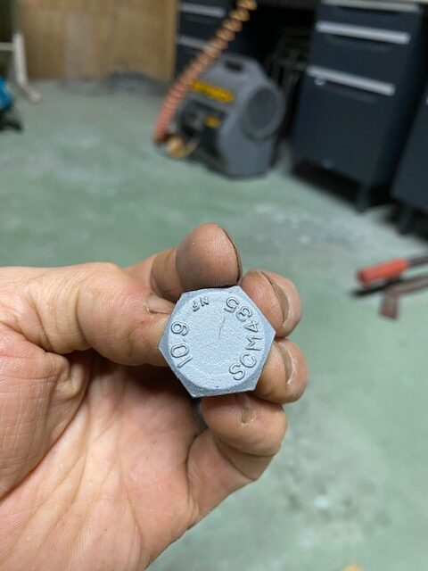 コテコテの塗料と錆とネジロック剤のカスだらけで、でも捨てるには勿体ない程度の良い状態…。こんな大きなゴツイボルト…。