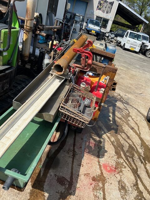 当時から結構工夫が多く(自慢^^)コア出しにコンプレッサーの空圧とフットスイッチを巧みに使用したり、管がクルクル回せながらバイスを挟めたり、泥廃液を循環して再利用してみたり、桶も全部地面から浮かせたり、勿論コア整理、観察台にしてみたり…。ドロ避けの流し台カバーをワンタッチで取り外し可能なステンレス製板を作ったり。 やはり簡易なクレーン付けてみたり、ケーシングやロッドを収納出来たり、 流し台を折りたたみにしたり、まだまだ伸びシロは豊富だね^^