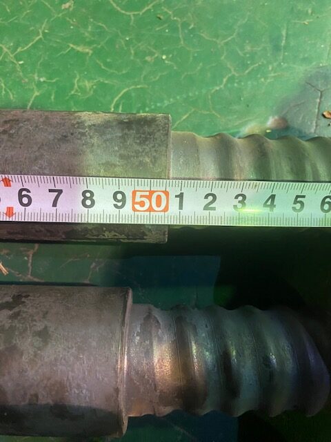 やはり、圧接時に数トンで押し込んでの全長サイズ合わせは、相当条件出しが難しいらしいです。そりゃソーダ!!今回の部材の場合、圧接部位1ヵ所あたりで約7~8mmの短縮を見積もってくださいって教わりました。