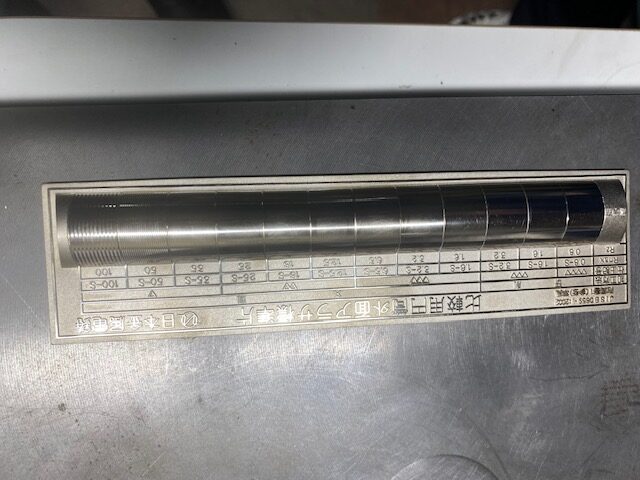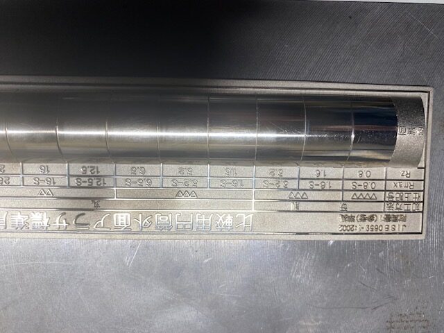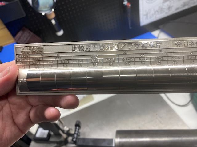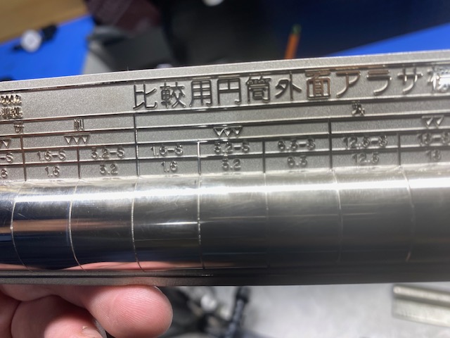 測定結果は端の部分のみで、簡単なチェックでしたが、4~5ミクロンの凹凸。比較用円筒外面アラサ標準片においても▽▽▽(三角3っつ)でまあ、合格で良いんじゃないですか!!って
