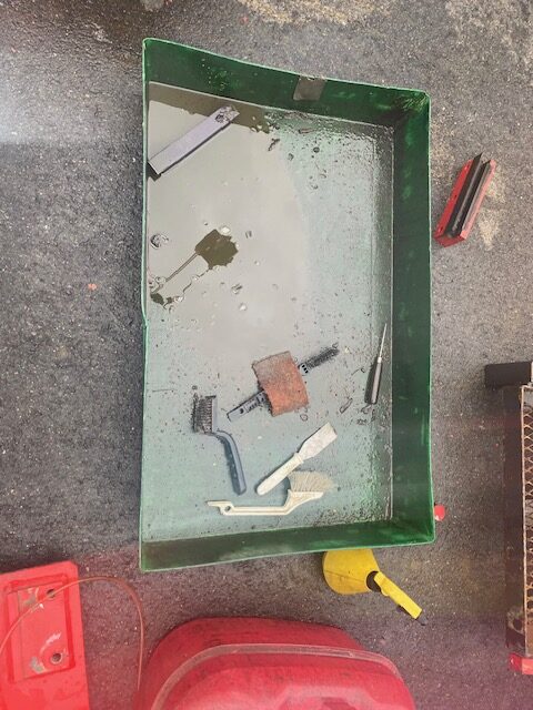 そして、ベアリングケース内部の焼けたような古いグリスを全てガソリンで洗浄し、さらにガソリン噴霧で吹き飛ばし洗浄、パキスタンの人みたいに、床にお尻ついて大きなバットの中でガソリンで洗浄です。