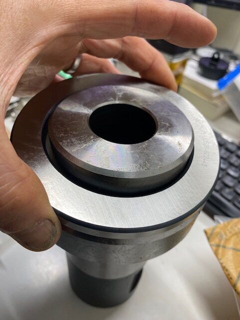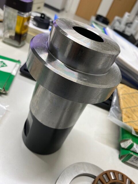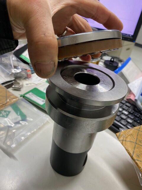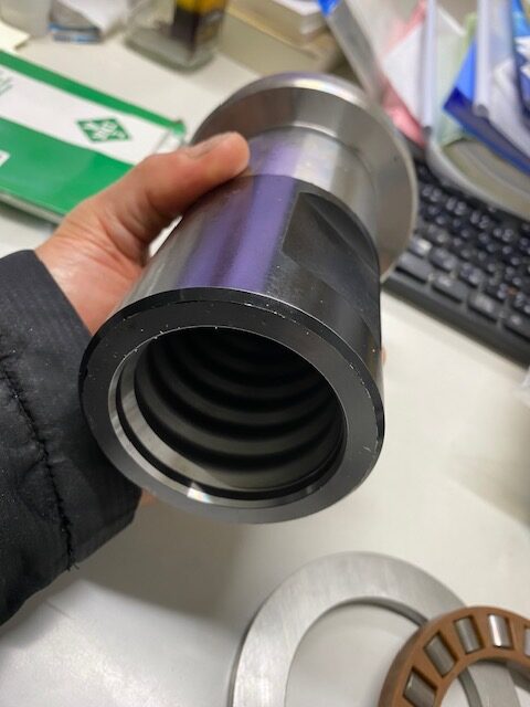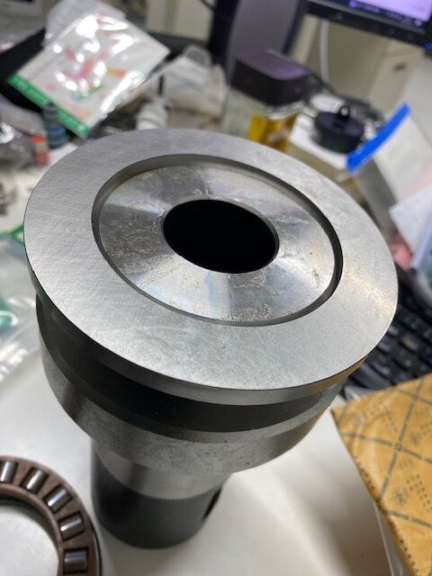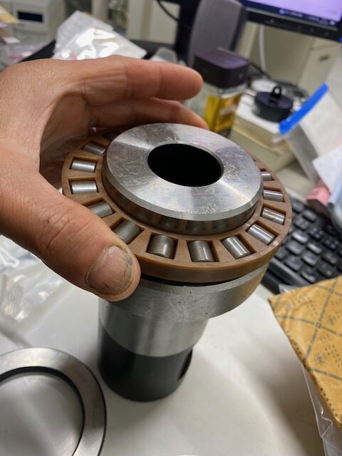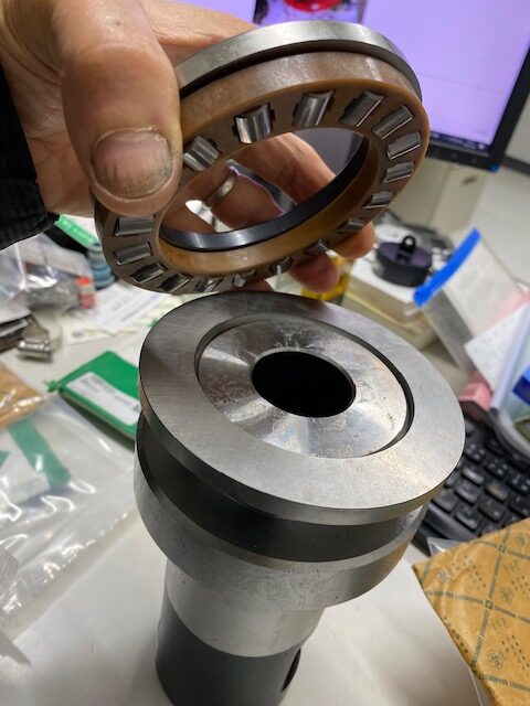 このコロ状のスラストローラーが回りながら、バイブロ起振力をシャフトを介して、シャンクロッドへ伝え、また打ちかえってきたシャンクロッドの反力をこのスラストローラーが、シャフトを介して、ガッツリと受け止めてます。